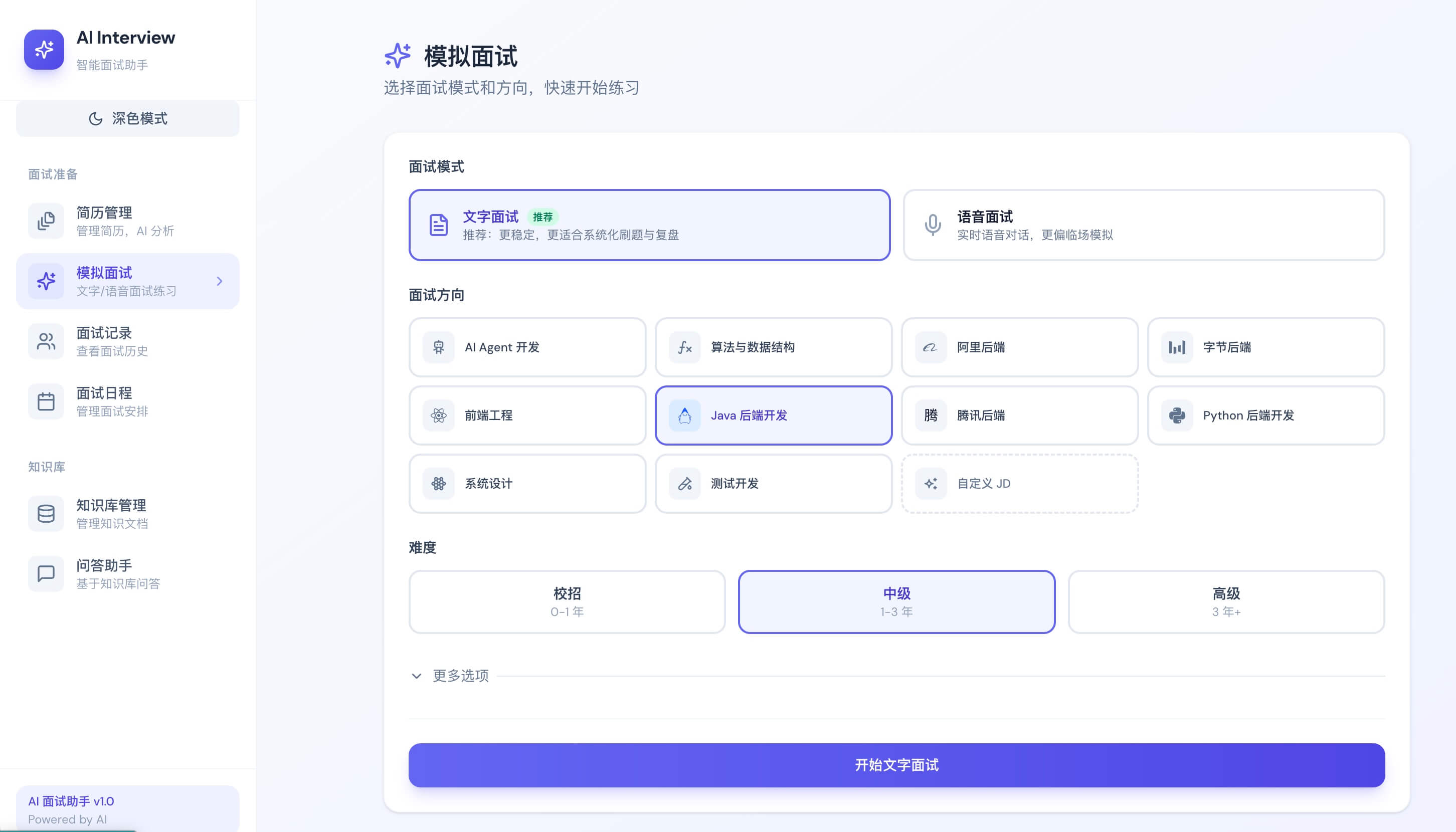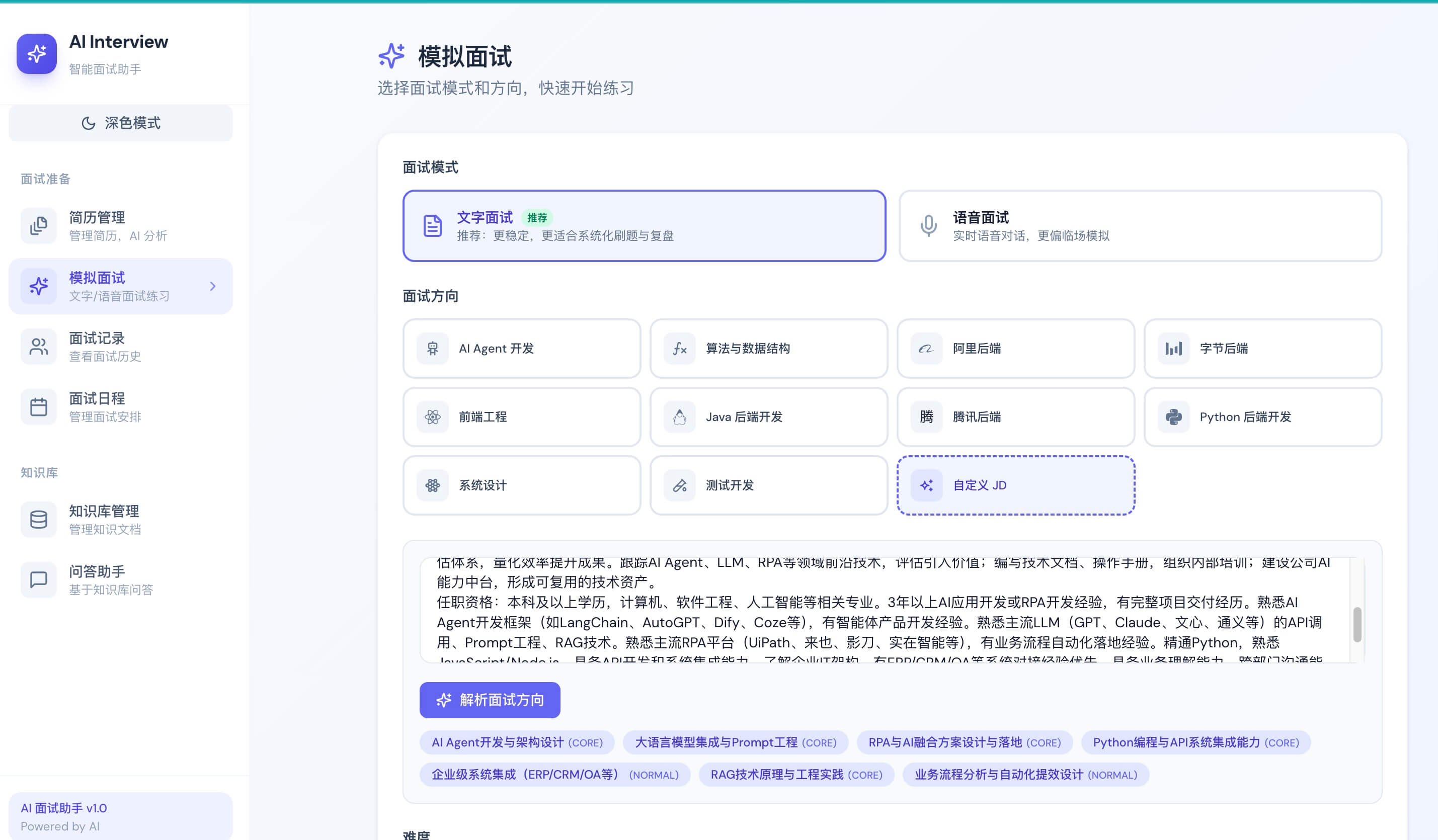 - 面试中心入口:面试中心页整合文字面试和语音面试入口,支持继续面试和重新面试。